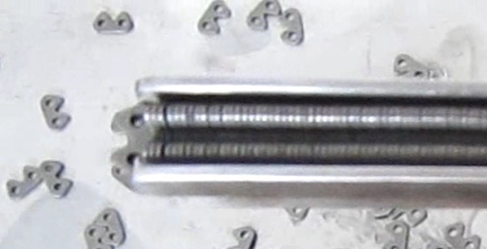 1. 震动盘自动排列好链条片, 送进直震轨道 2. 链条片沿4条轨道, 进入弯轴连杆机构 3. 弯轴连杆机构, 把链条片按方向排迭, 进入下料轨道 4. 成品进入成品区 |
